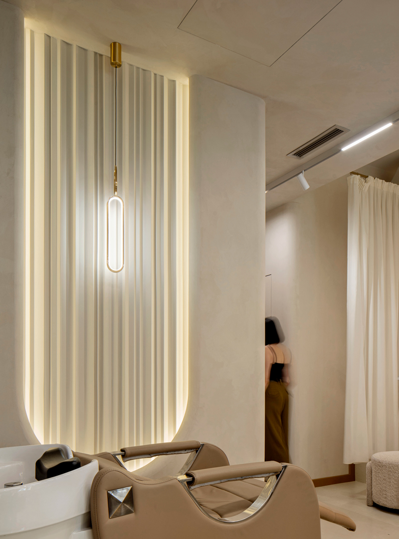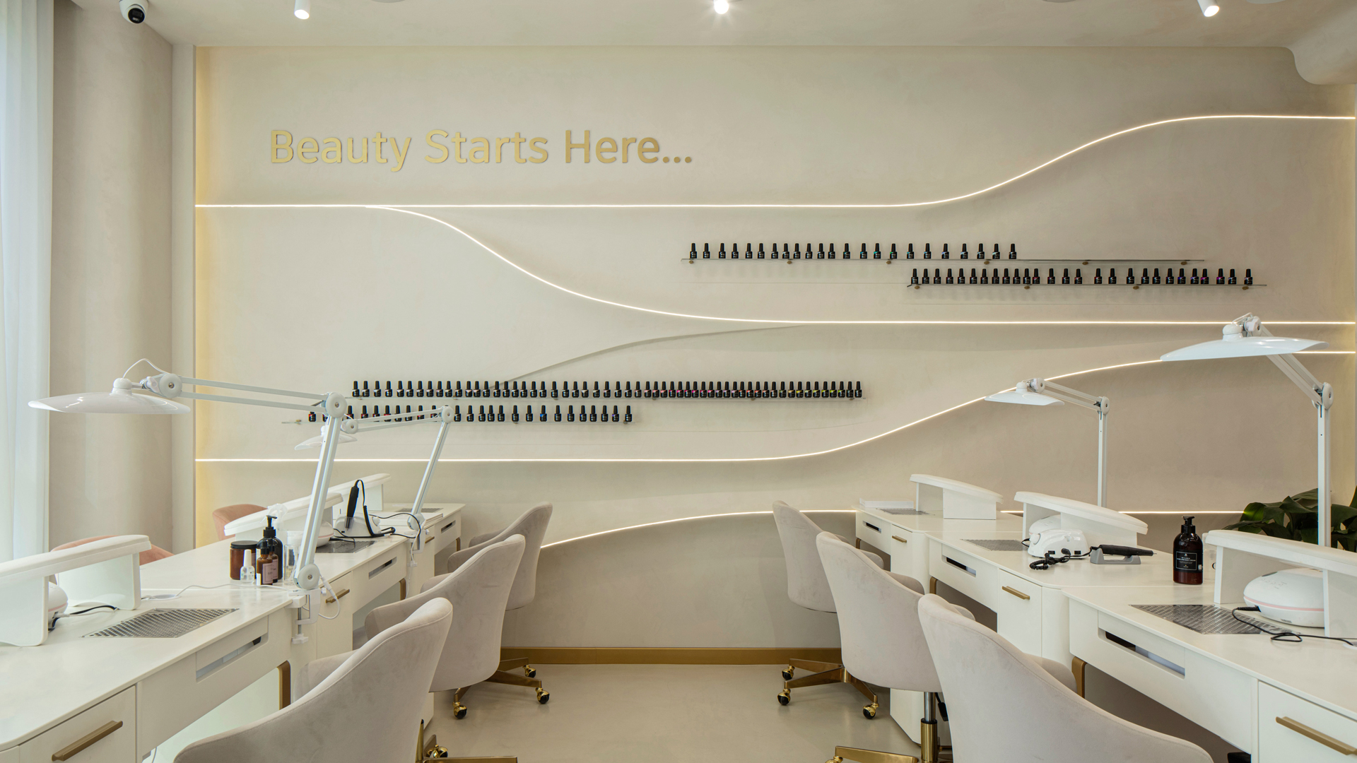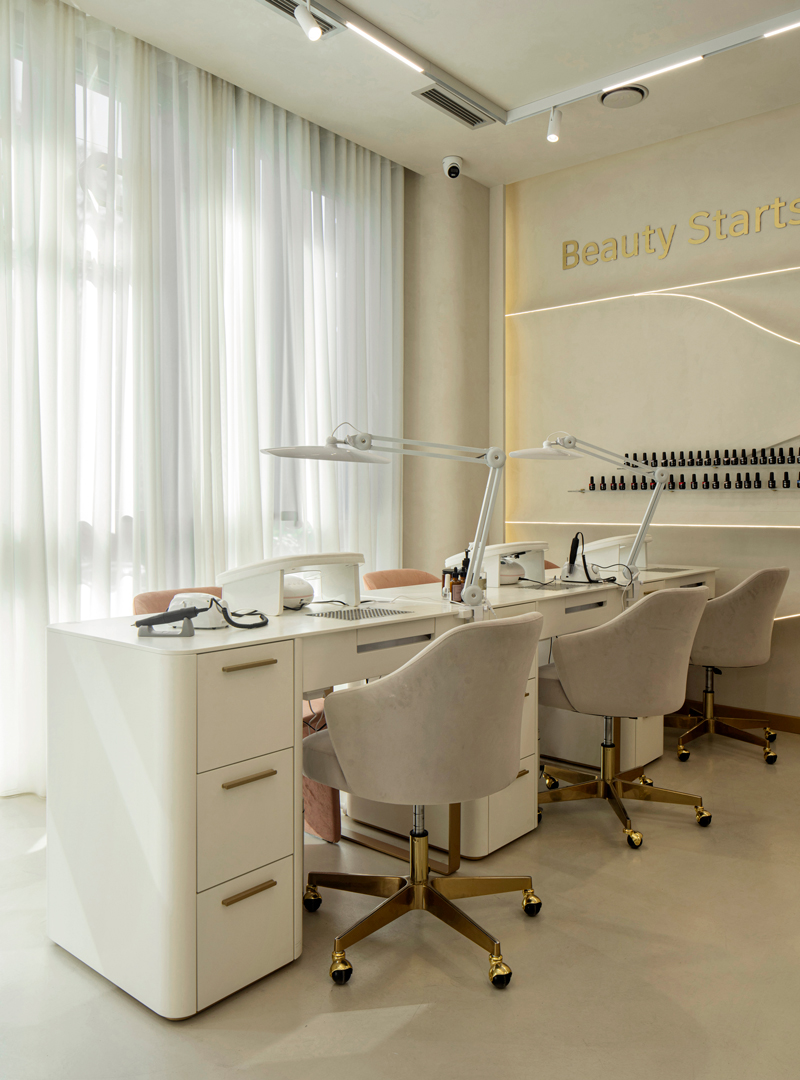 Проектированная с акцентом на точность и порядок, зона маникюра наполнена светом и ясностью. Плавные линии освещения отражают поток энергии, создавая ощущение равновесия. Центральная точка пространства обозначена мотивирующей цитатой: «Красота начинается здесь…».