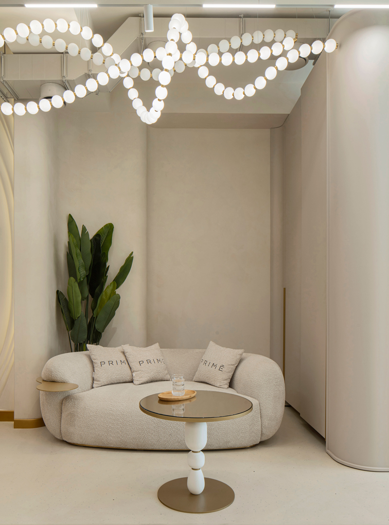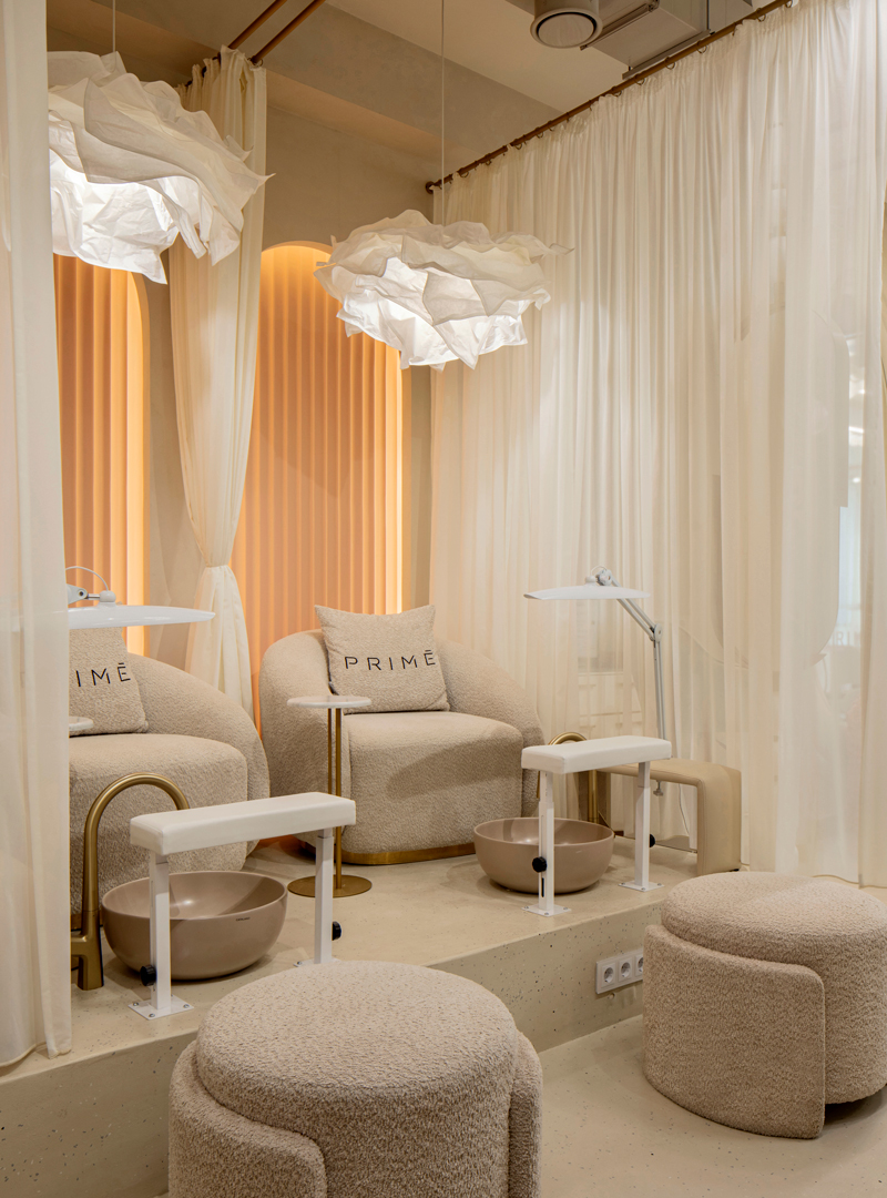 Интерьер Prime Beauty Space выдержан в нейтральной палитре, что создаёт спокойную и в то же время премиальную атмосферу. Гостей здесь встречает вдохновляющая цитата: «Красота начинается здесь».