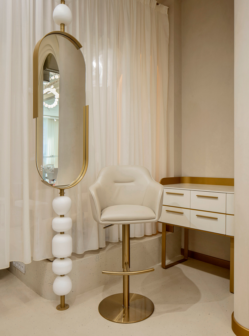 В этом проекте клиент попросил предусмотреть отдельную фотозону, где посетители могли бы запечатлеть свои образы, а также сделать зону педикюра максимально ненавязчивой и скрытой от глаз.
